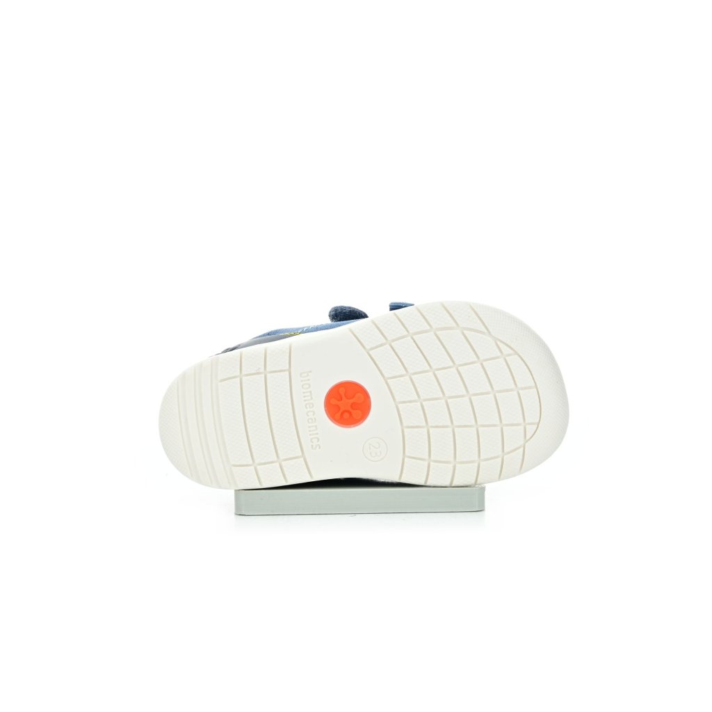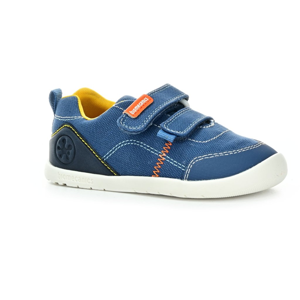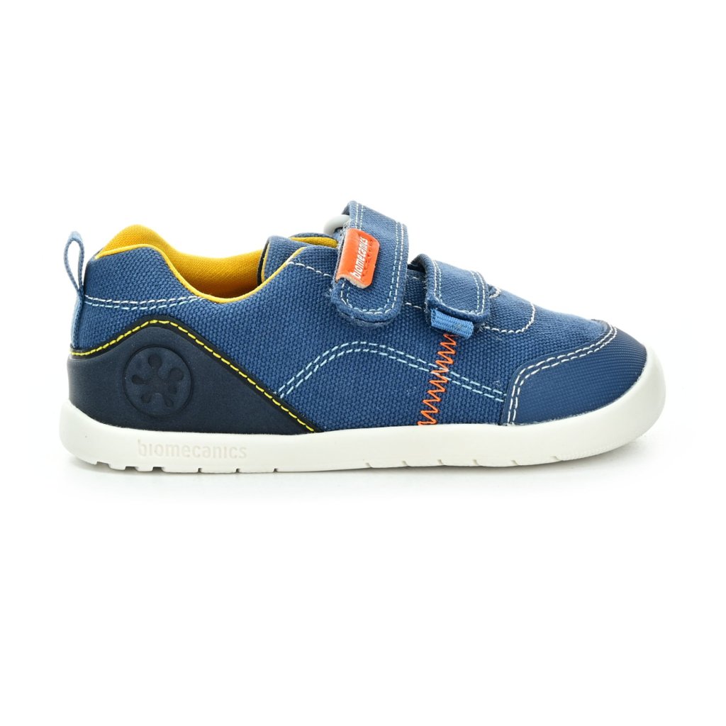 Dětské barefoot tenisky Biomecanics jsou lehké a flexibilní pro první krůčky i každodenní pohyb. Díky páskům na suchý zip dobře drží i na širší noze a sportovní modré provedení s kontrastními detaily dodává modelu hravý vzhled pro aktivní dny venku.